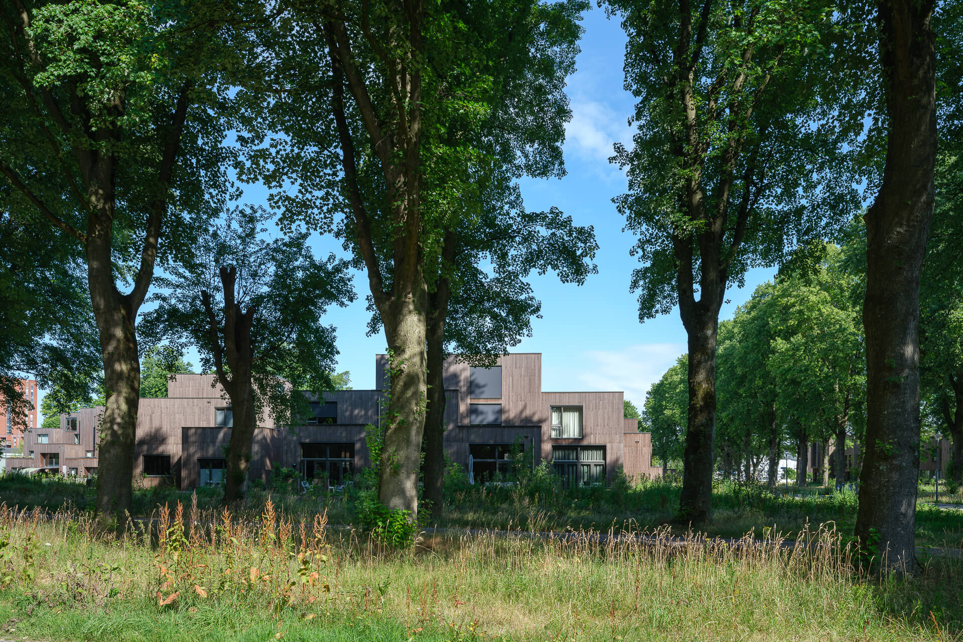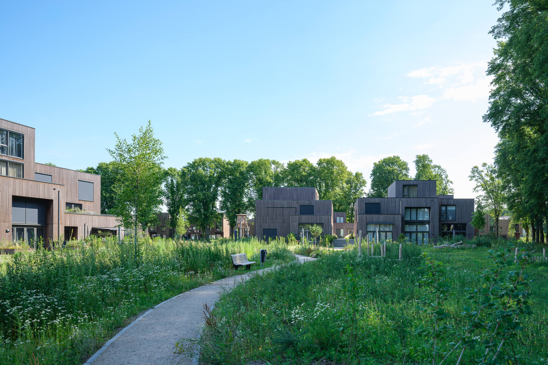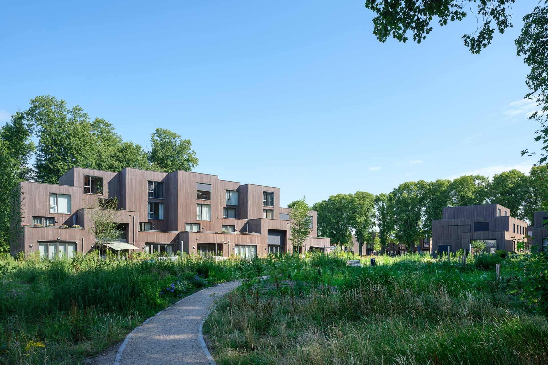 Every cluster has a different character inspired by the experience of space in a forest: Lint (the ribbon) comprises 9 rowhouses; Heuvel (hill) contains 12 residences, with ground floor access, in a terraced building; and Hof (courtyard) groups 12 residences around a courtyard. All are designed as Open Buildings that enable the flexibility for residents to customise their homes, and adapt them over time. This results in 33 unique residences, which range in size from 104 – 275m2, for 32 unique households. The structure, façade, partitions and services are separated, and can be updated according to their separate lifecycles. In this way, individual houses can easily adapt to evolving needs and technologies, thereby future-proofing the buildings for life.