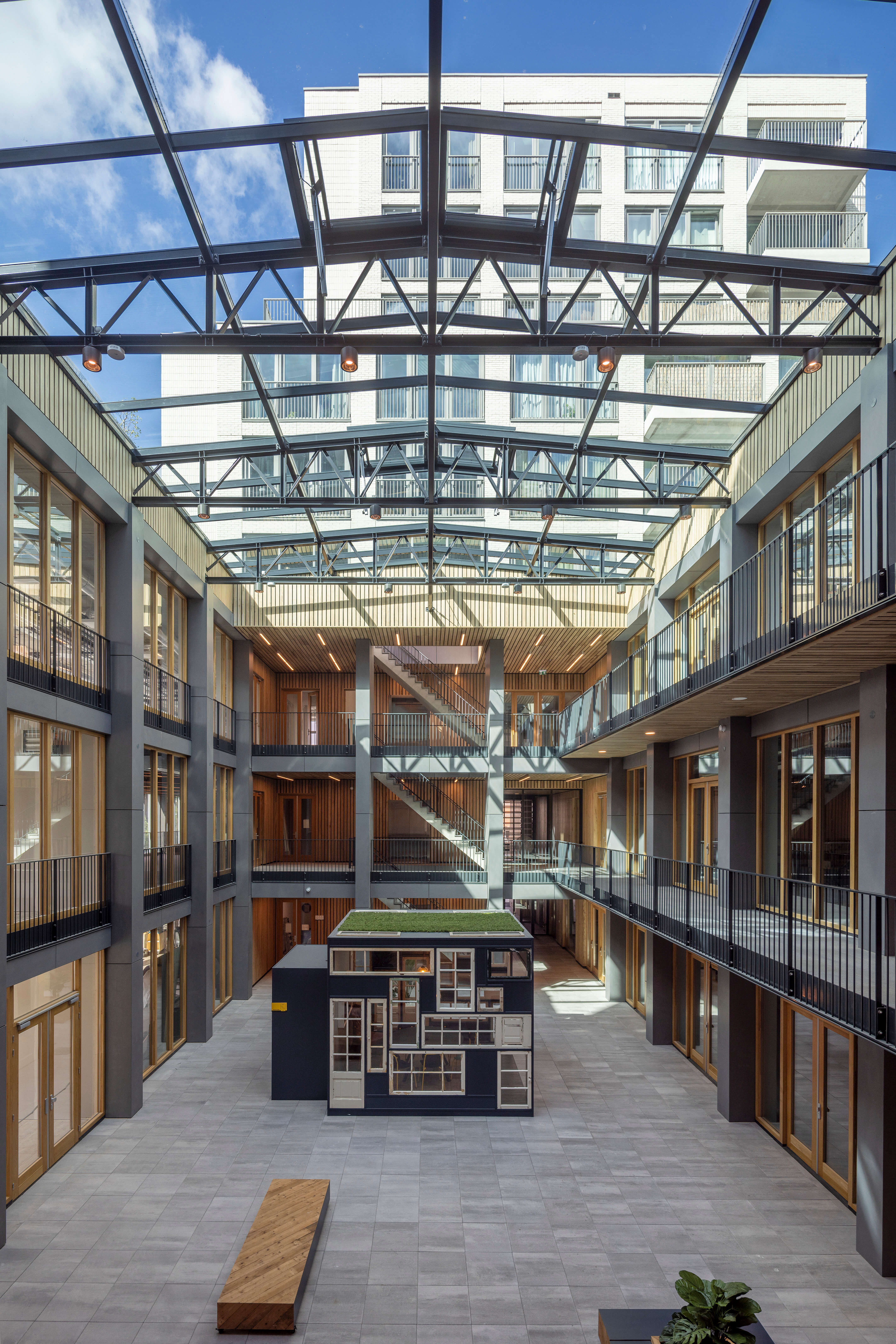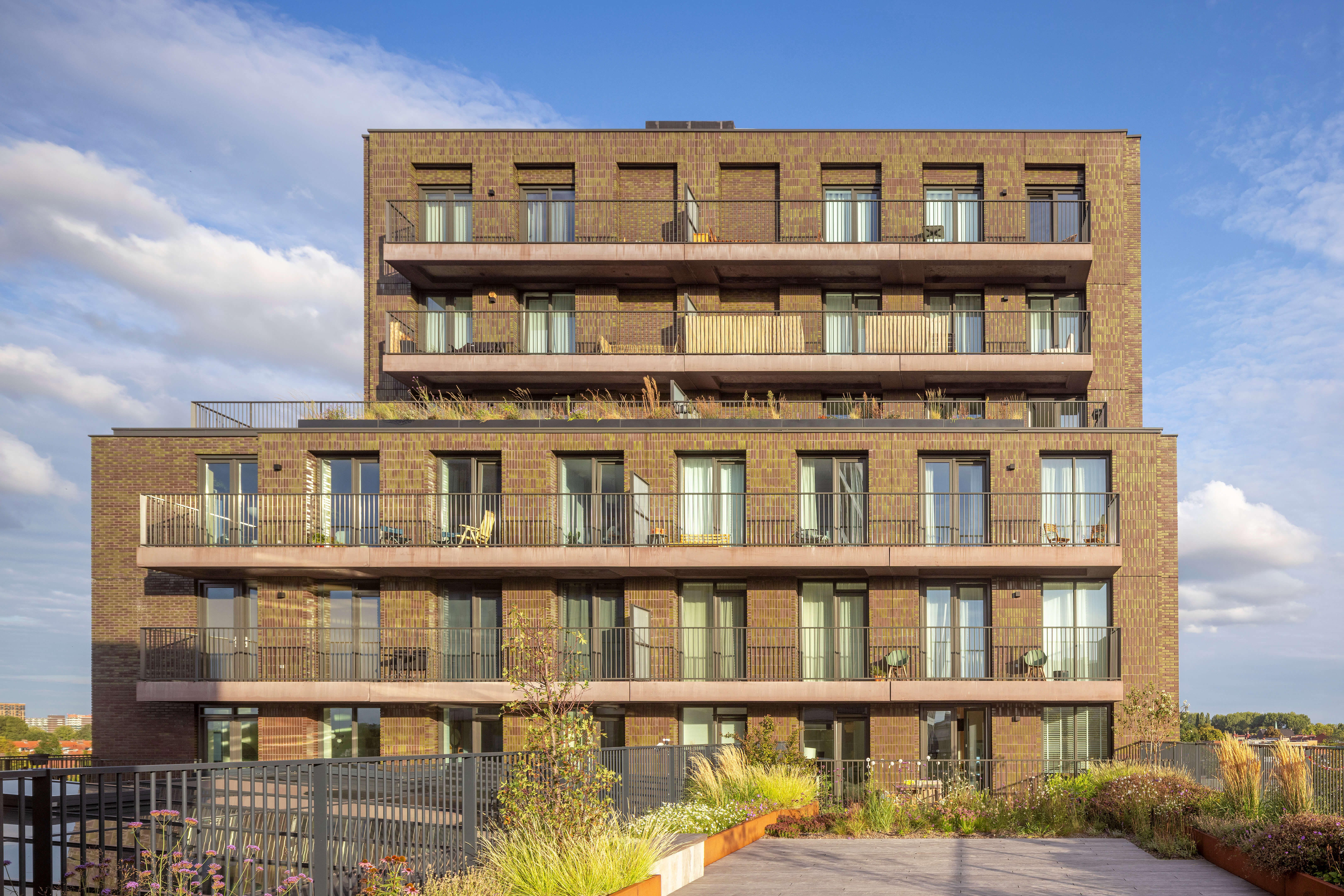 Mark taps into the new energy of Buiksloterham with a dynamic mixed-use complex for living, working and leisure. A three-storey podium with atrium forms the social hub where hospitality venues, (co) working spaces, work/home ateliers and a shared roof terrace create a lively buzz. Above, two residential towers contain compact, flexible lofts with high, bright interiors and generous outdoor spaces. Its patchwork of volumes, colours and (circular) materials reflects Buiksloterham’s diversity and ambitions for a circular future.