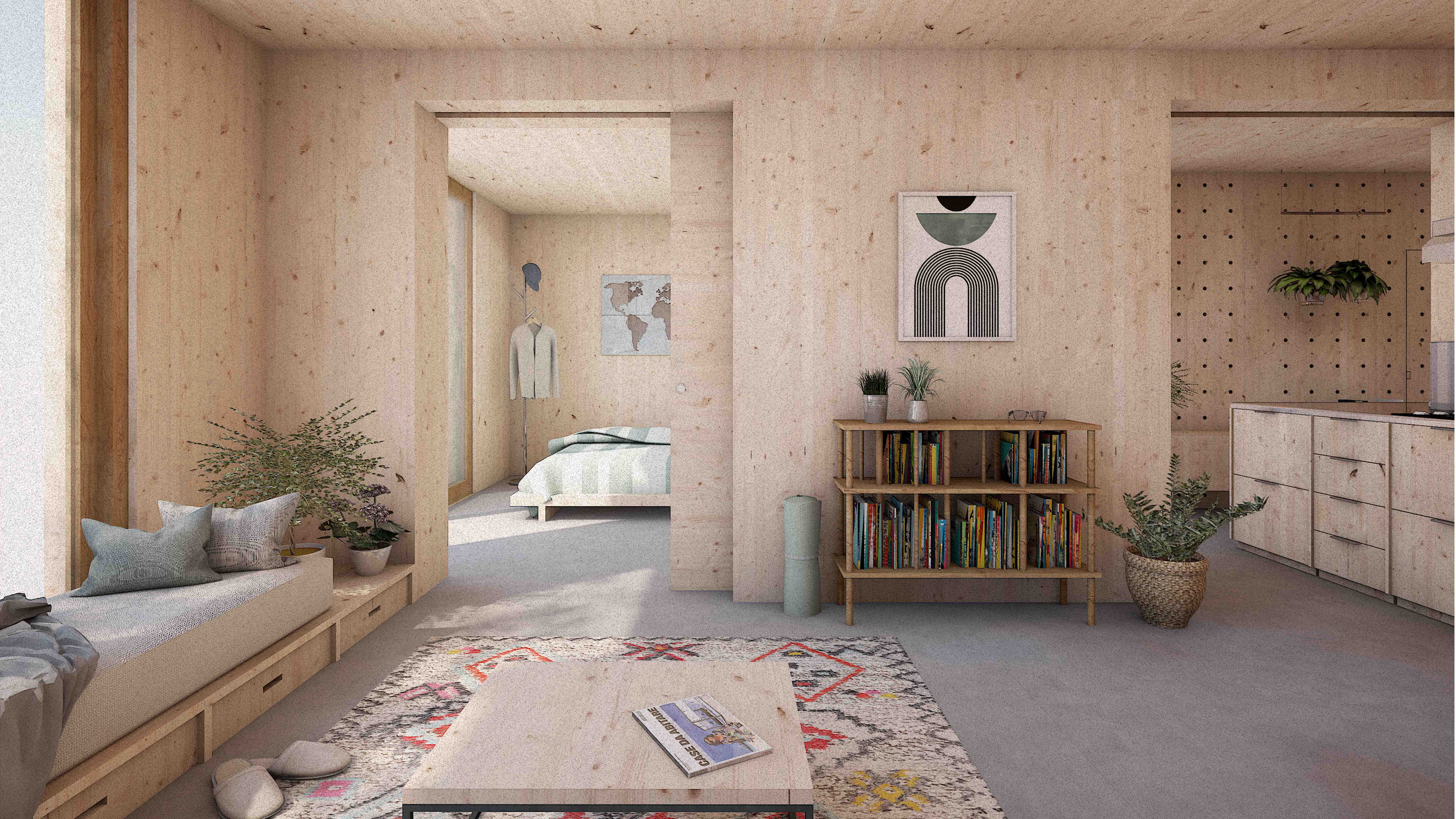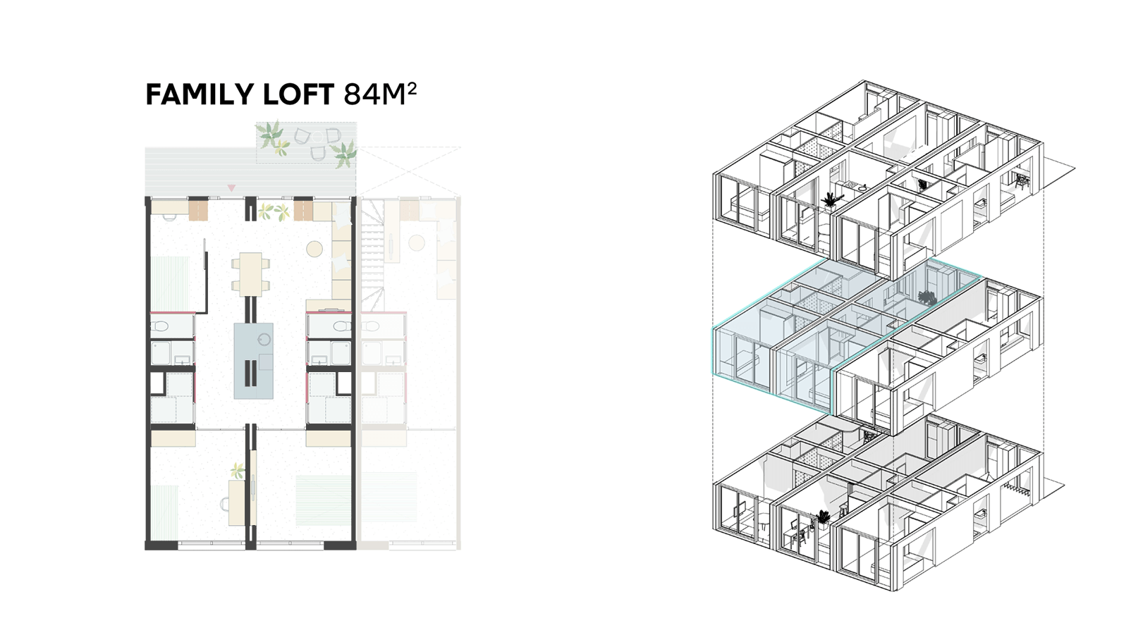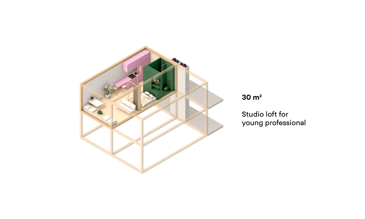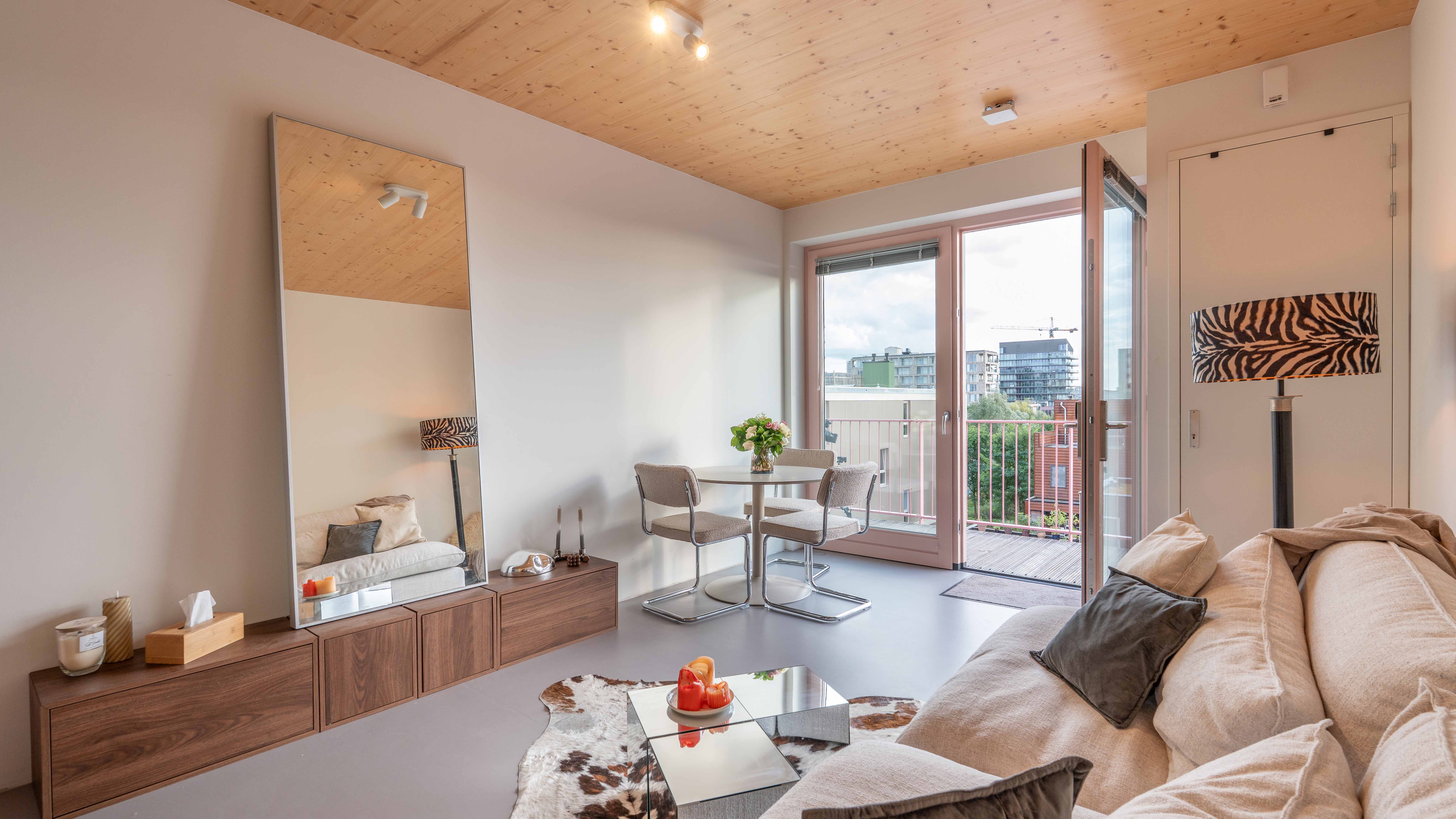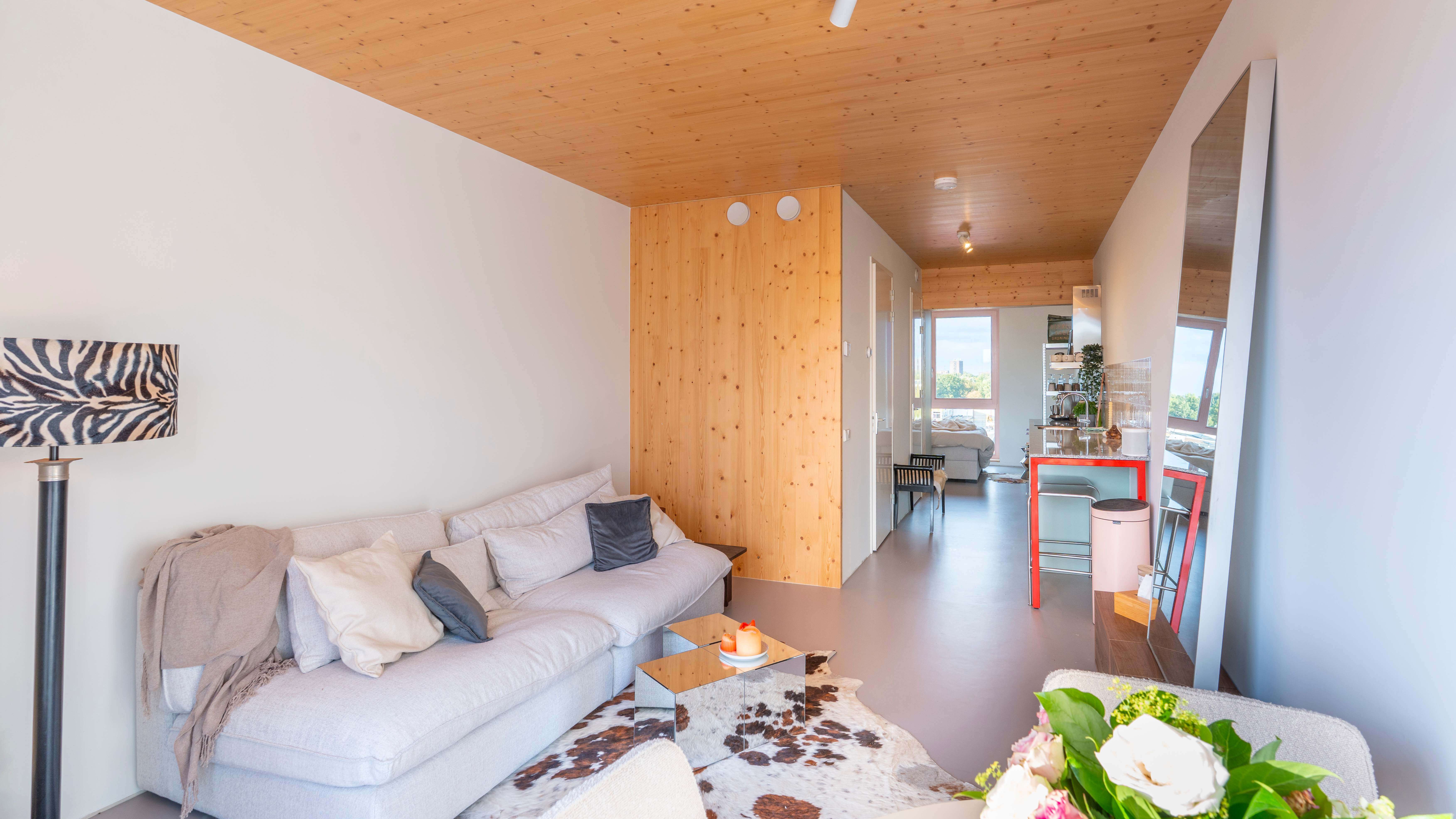 the ultra compact, efficient 63m2 Superwood loft contains two bedrooms, a generous living and dining area with loads of daylight and wide views. The modular concept also offers larger apartments such as a three bedroom-, a 84m2 family- or friends house or a duplex apartment. Superwood also offers a 42m2 studio loft.