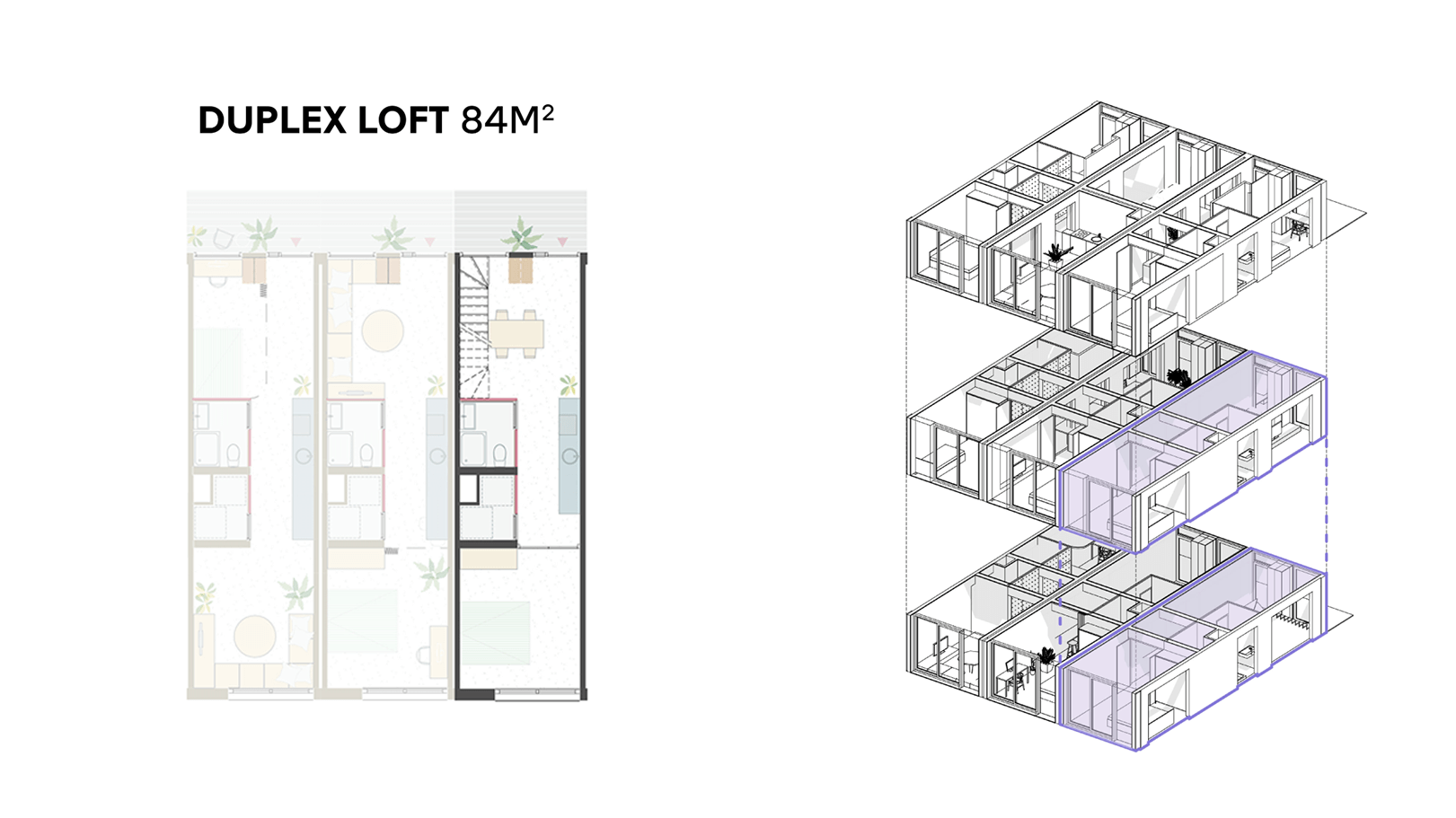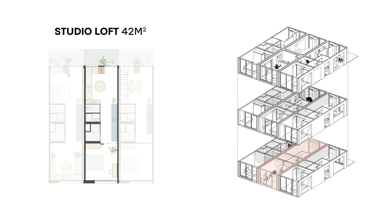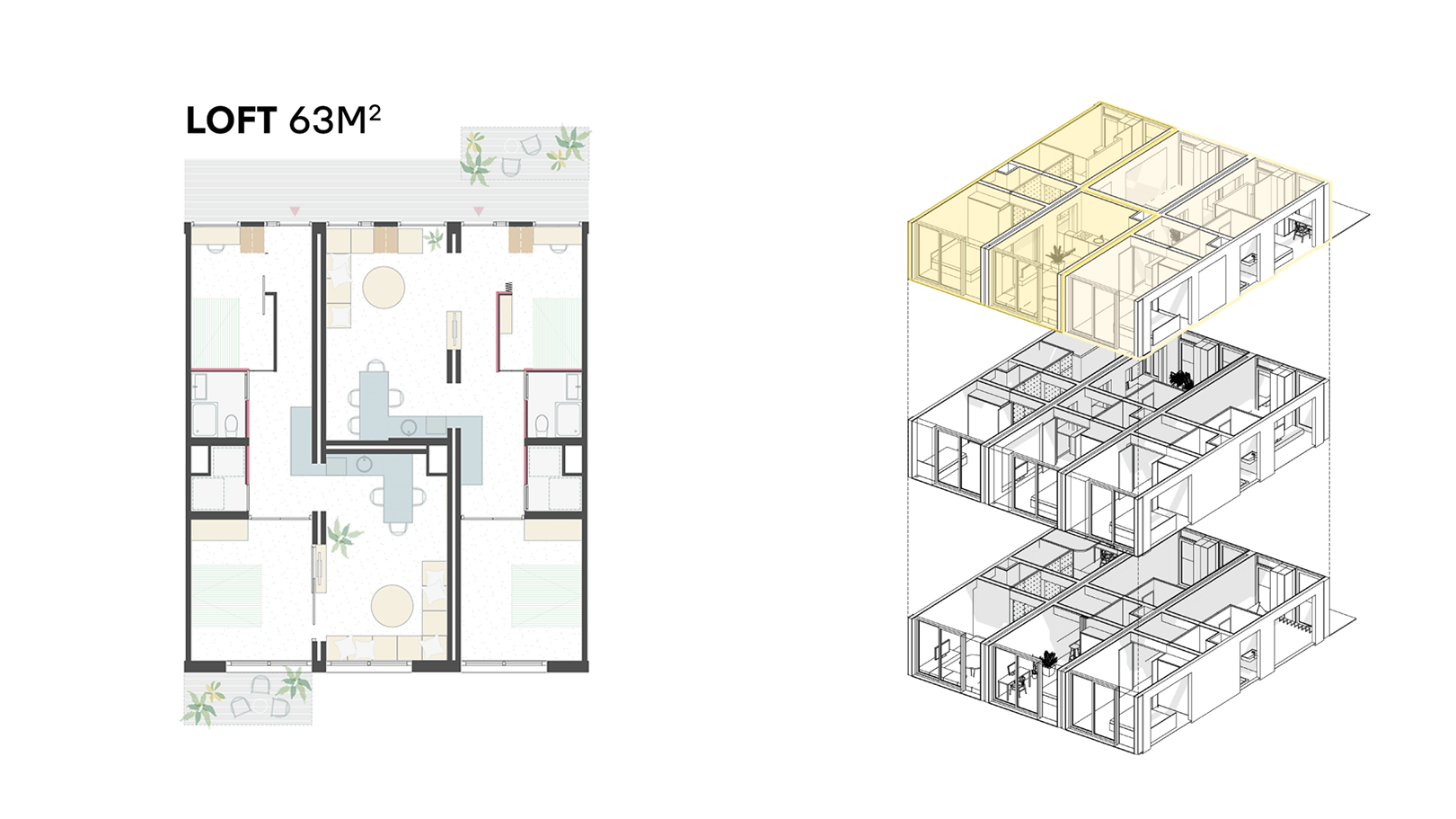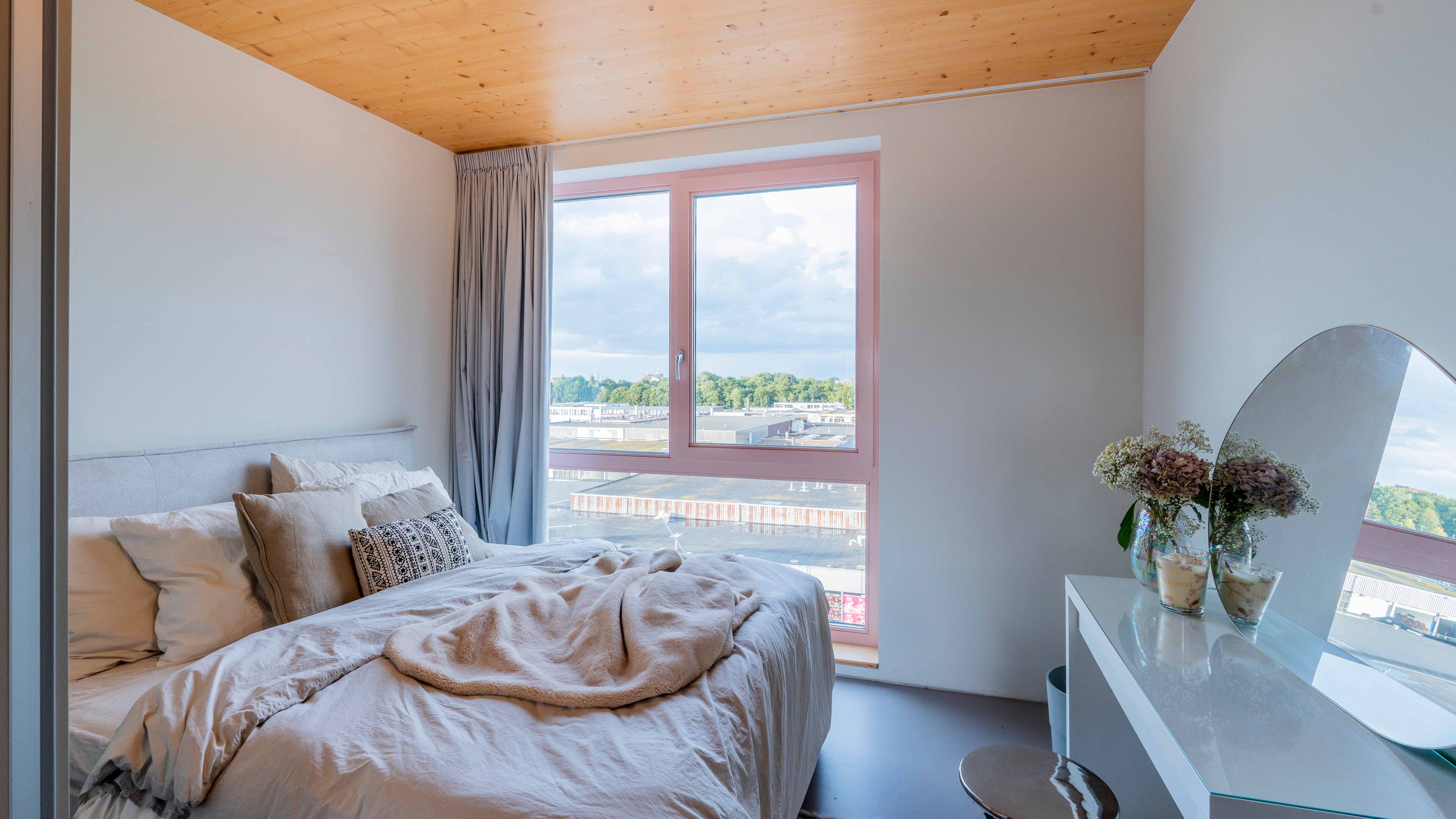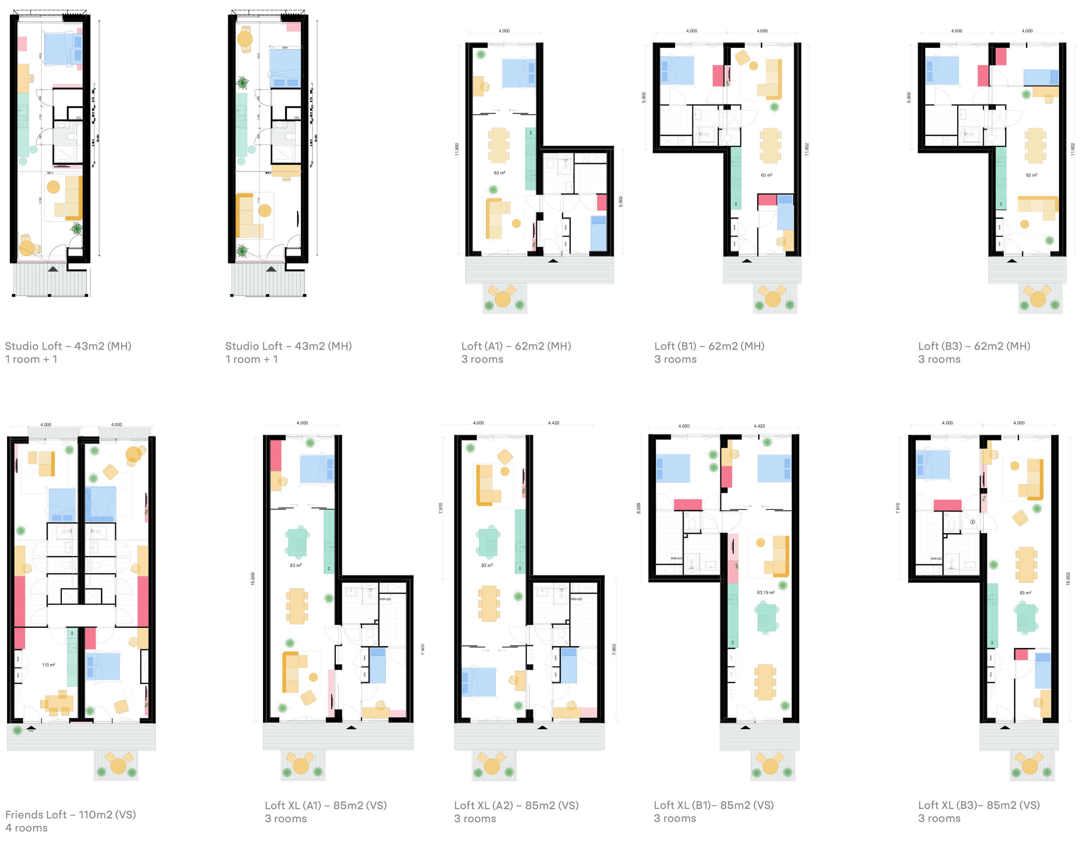the ultra compact, efficient 63m2 Superwood loft contains two bedrooms, a generous living and dining area with loads of daylight and wide views. The modular concept also offers larger apartments such as a three bedroom-, a 84m2 family- or friends house or a duplex apartment. Superwood also offers a 42m2 studio loft.