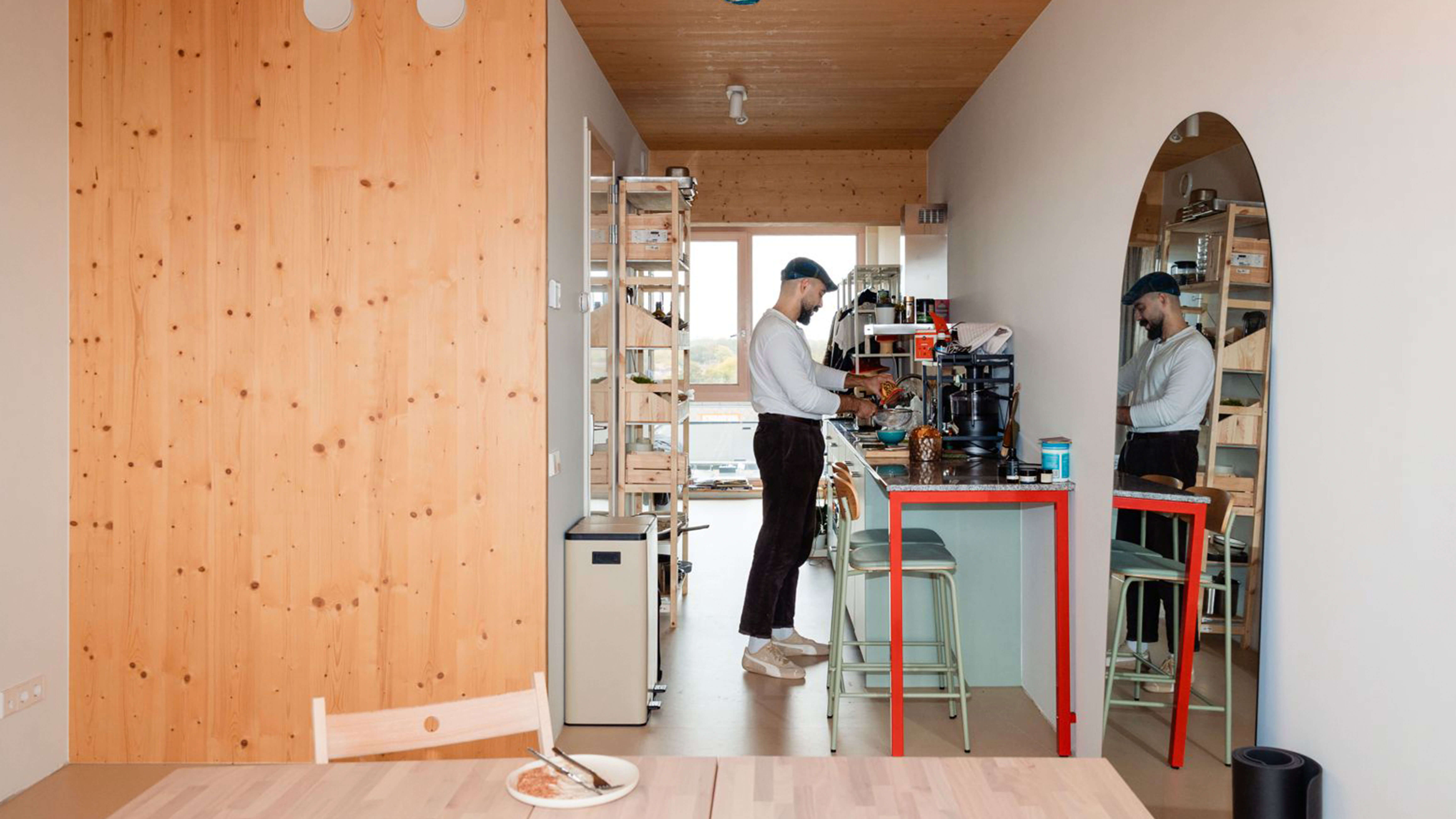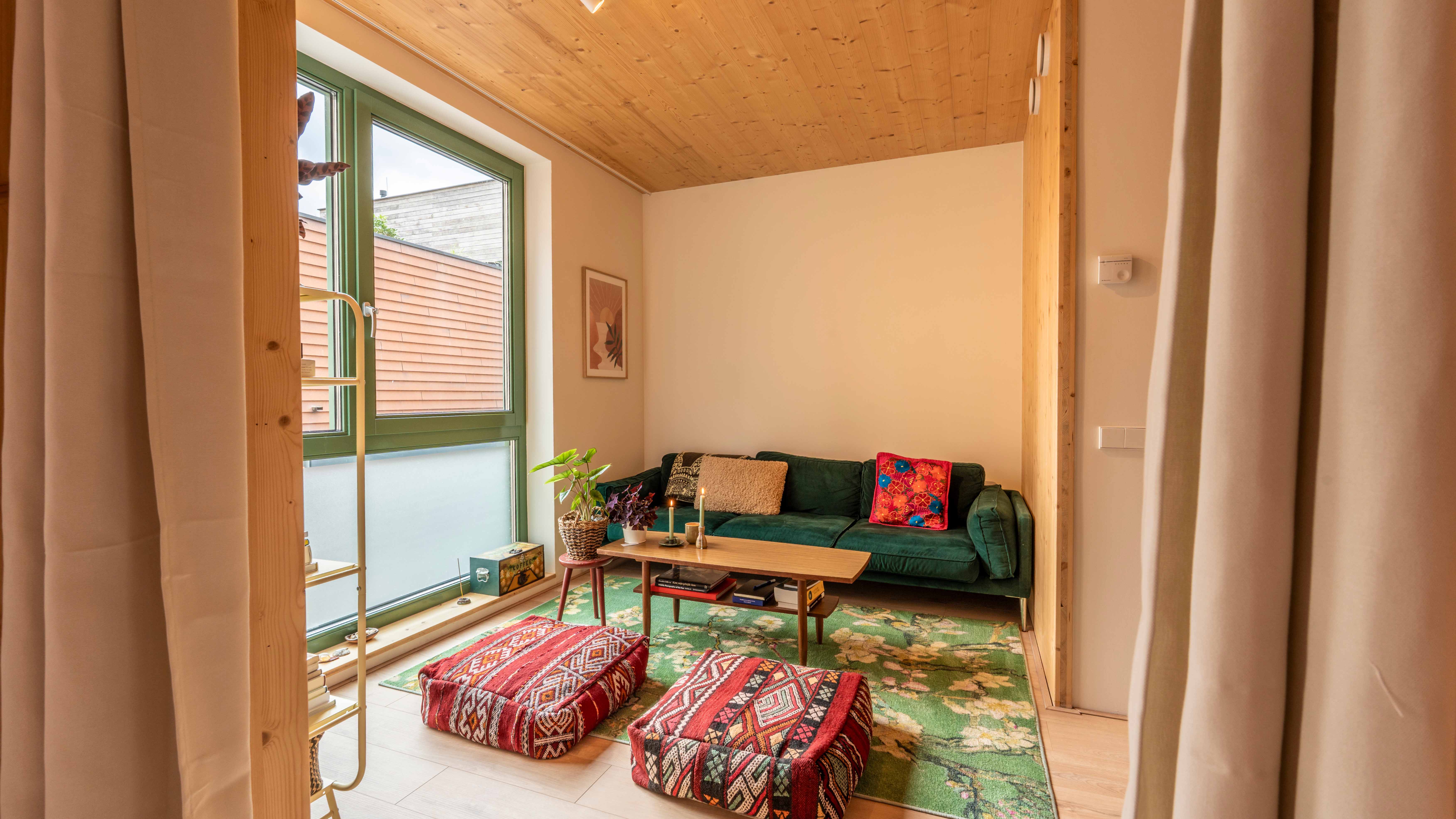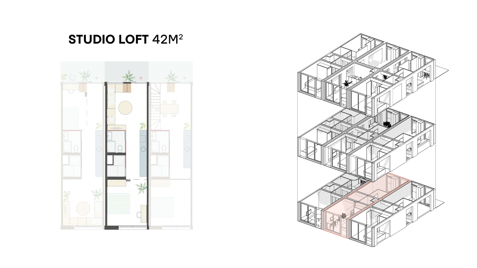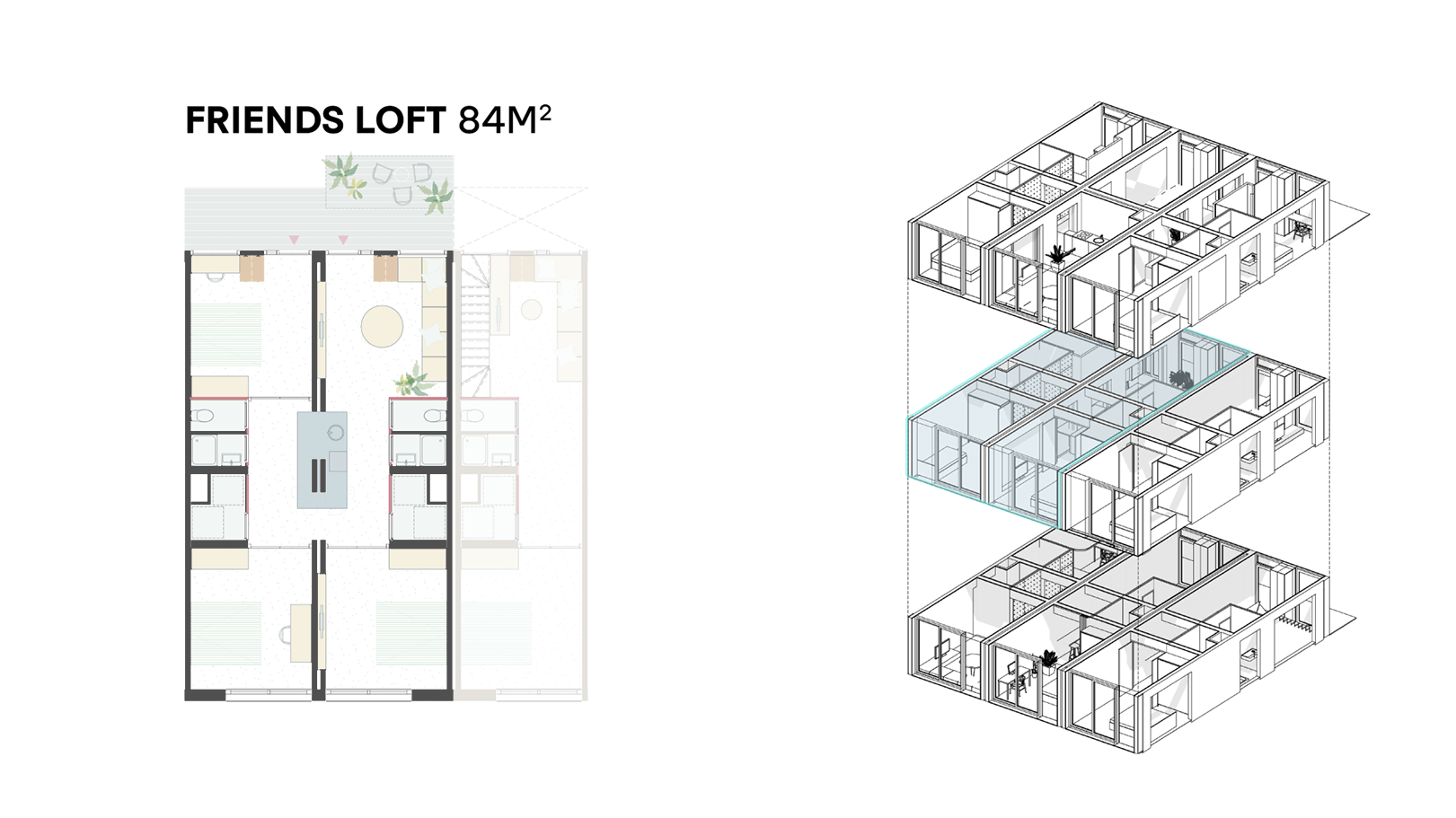 the ultra compact, efficient 63m2 Superwood loft contains two bedrooms, a generous living and dining area with loads of daylight and wide views. The modular concept also offers larger apartments such as a three bedroom-, a 84m2 family- or friends house or a duplex apartment. Superwood also offers a 42m2 studio loft.