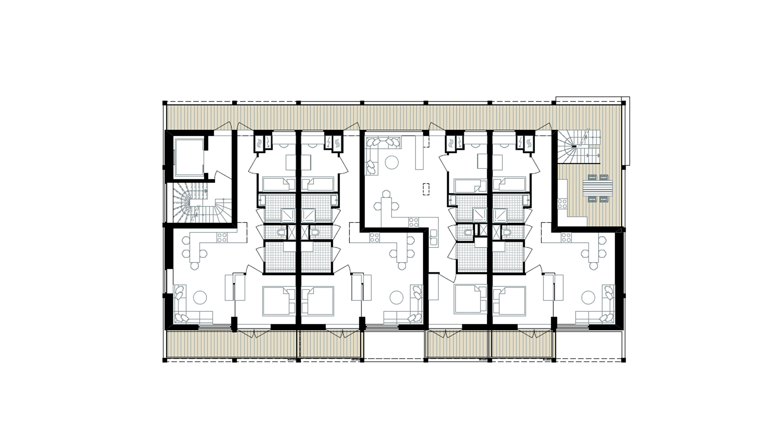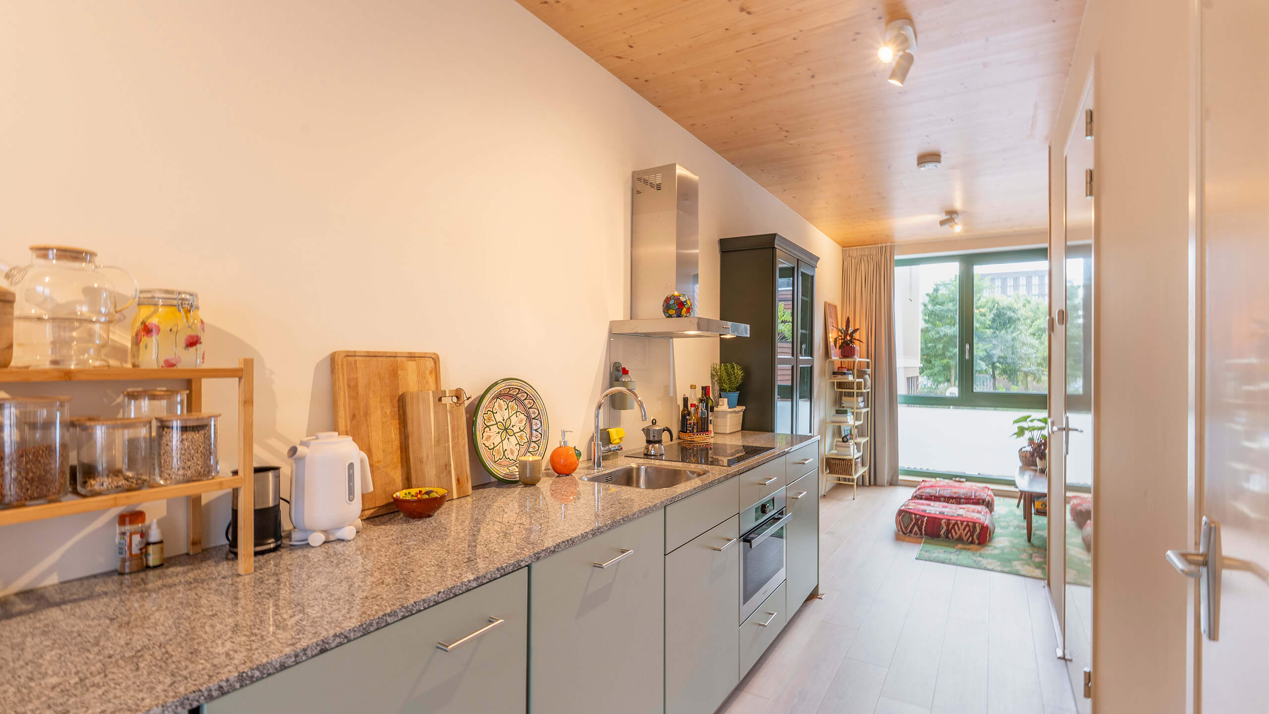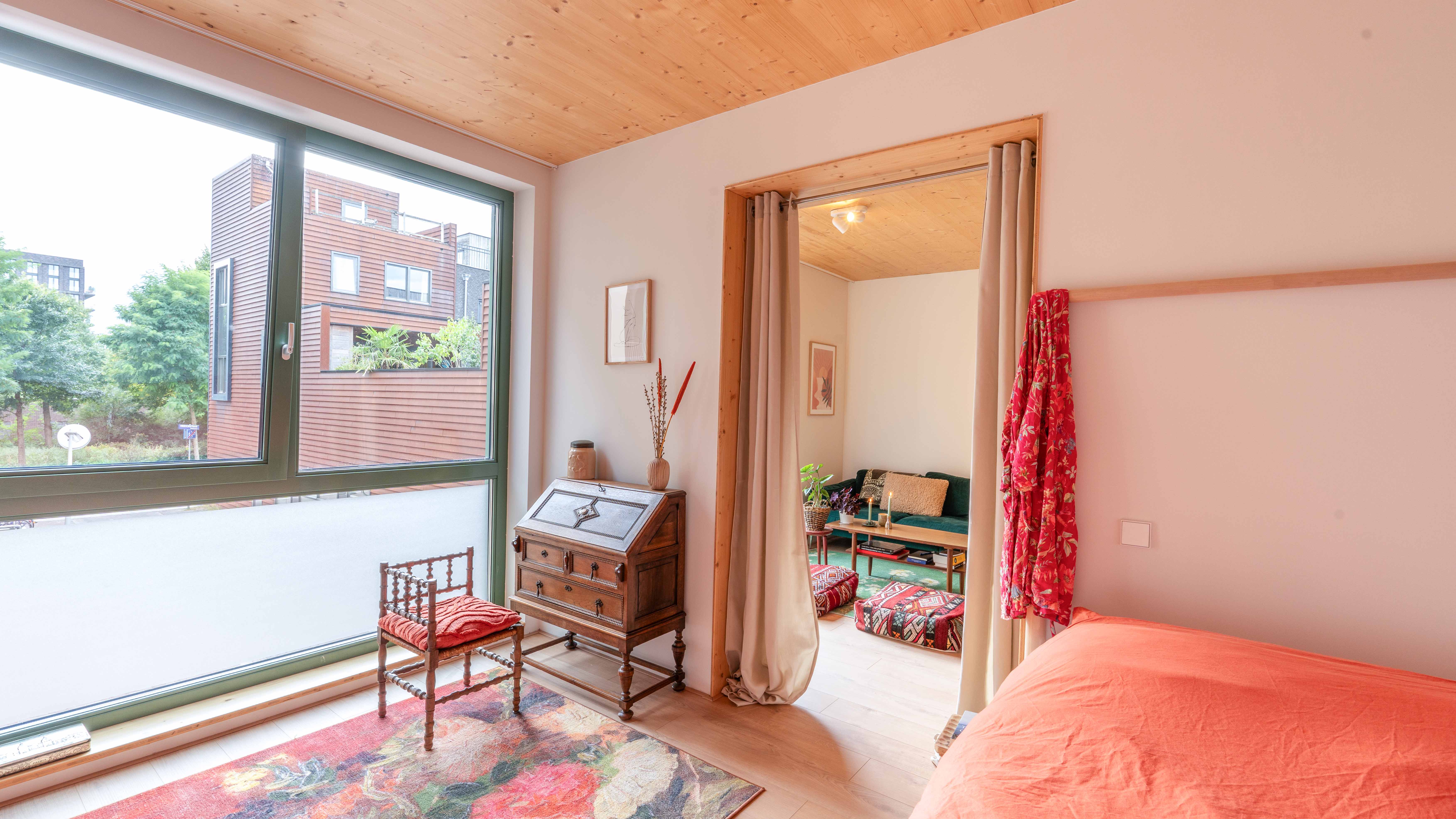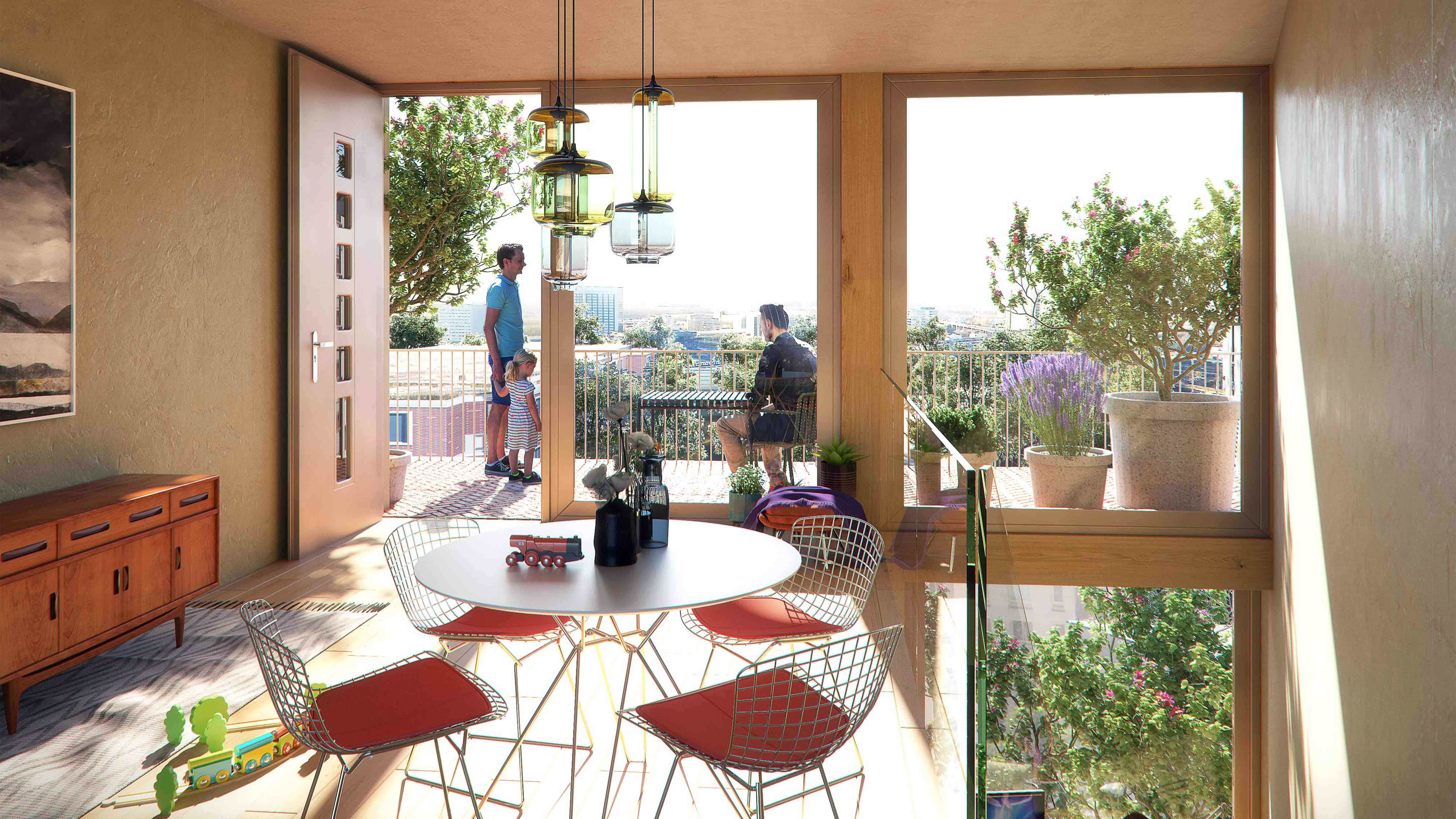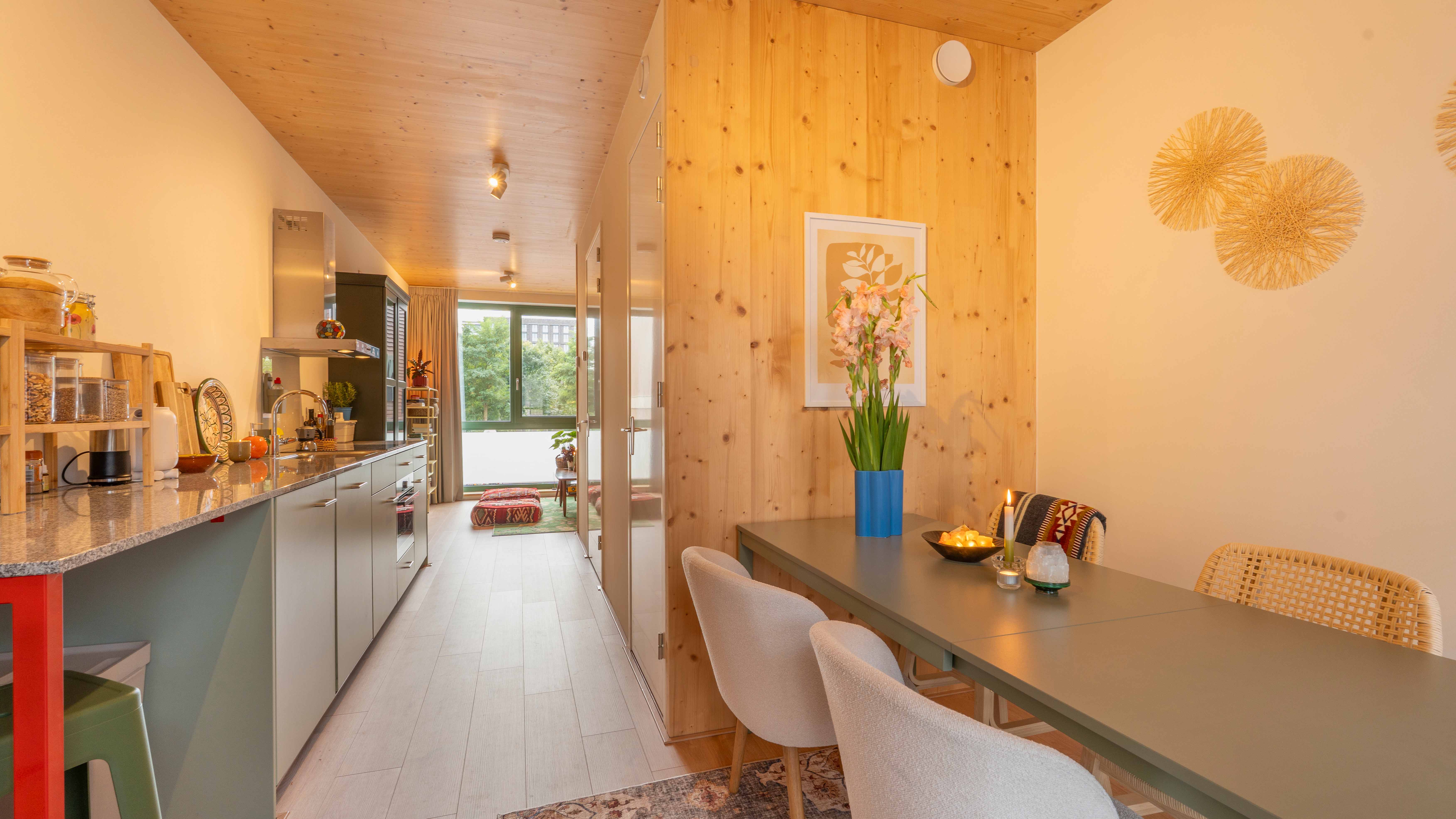 the ultra compact, efficient 63m2 Superwood loft contains two bedrooms, a generous living and dining area with loads of daylight and wide views. The modular concept also offers larger apartments such as a three bedroom-, a 84m2 family- or friends house or a duplex apartment. Superwood also offers a 42m2 studio loft.